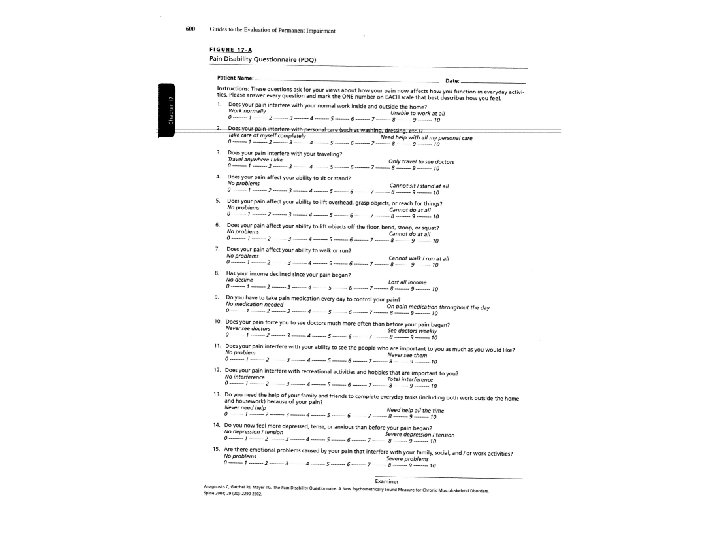 Pain and Subjective Complaints • 6 th Edition takes into account pain and subjective complaints. • The Functional History uses the Quick. Dash for upper extremities, Lower Limb Questionnaire for lower extremities, Pain and Disability Questionnaire for spinal injuries. • These questionnaires rely on subjective and pain complaints. • “The Guides is based on objective criteria. Subjective complaints (e. g, fatigue, difficulty concentrating, sleep difficulties, and weakness) when not accompanied by demonstrable clinical signs or other independent, measurable abnormalities are generally not given impairment ratings. ” (page 24) • Functional History is based on subjective reports that are attributable to impairment. (page 406)