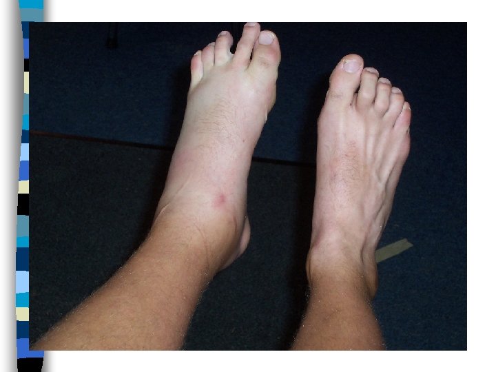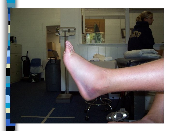 Ankle Assessment Principles: Observation n n n Is there obvious deformity? Is there any discoloration? Is there crepitus or abnormal sound in the joint? Is heat, swelling, or redness present? Is the athlete in obvious pain? Does the athlete have normal range of motion? Is there a normal walking pattern?