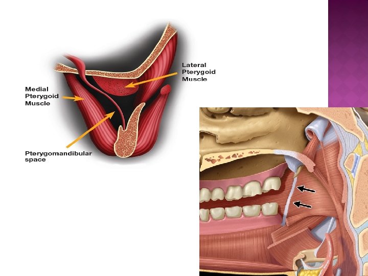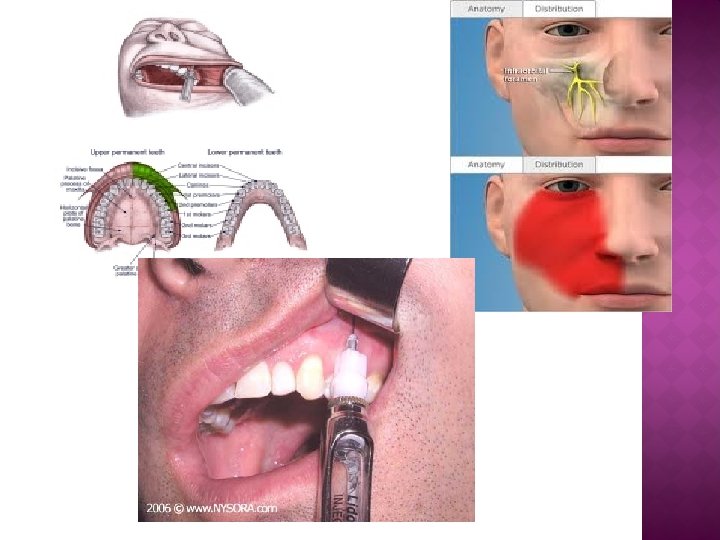 � Landmarks: We locate the mucobuccal fold where it intersects with the apex of the canine tooth by retracting the membrane with gauze or our finger and pulling it out and down. � Technique: While retracting the lip, insert the needle into the intersection of the mucobuccal fold and the apex/center of the canine at a 45 -degree angle, advancing the needle approximately 1 -1. 5 cm. Aspirate. Slowly inject 2 m. L of local anesthetic and massage for 10 -20 seconds.