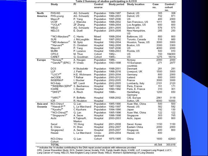 BER Pathway l Polymorphisms in the BER pathway may alter the repairing capacity of this pathway and modify the risk of lung and head-and-neck cancers. l To examine the individual associations of the h. OGG 1 Ser 326 Cys, APEX 1 Asp 148 Glu, PCNA C T (intron 2), XRCC 1 Arg 194 His and Arg 280 His, LIG 1 T C (exon 25), A C (exon 6), C T (exon 2), and A G (intron 1), – and LIG 3 C T (exon 21) polymorphisms – with the risk of lung and head-and-neck cancer, and to investigate whether these polymorphisms alter the effects of environmental risk factors, including active and passive cigarette smoking and alcohol drinking, on the development of lung and head-and-neck cancer in the population of Los Angeles County. – – –