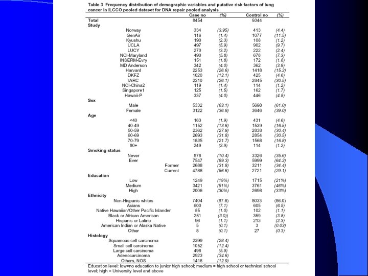 Confounding Variables l Age – <35, 35 -36, 37 -38, 39 -40, 41 -42, 43 -44, 45 -46, 47 -48, 49 -50, 51 -52, 53 -54, 55 -56, 57 -58, and 59 -62 l l Gender Race/ethnicity – white, Mexican American, African American, Asian American, and other l Education level – years of schooling l l Pack-years of smoking Alcohol consumption (for head-and-neck cancer only) – alcohol drink-years