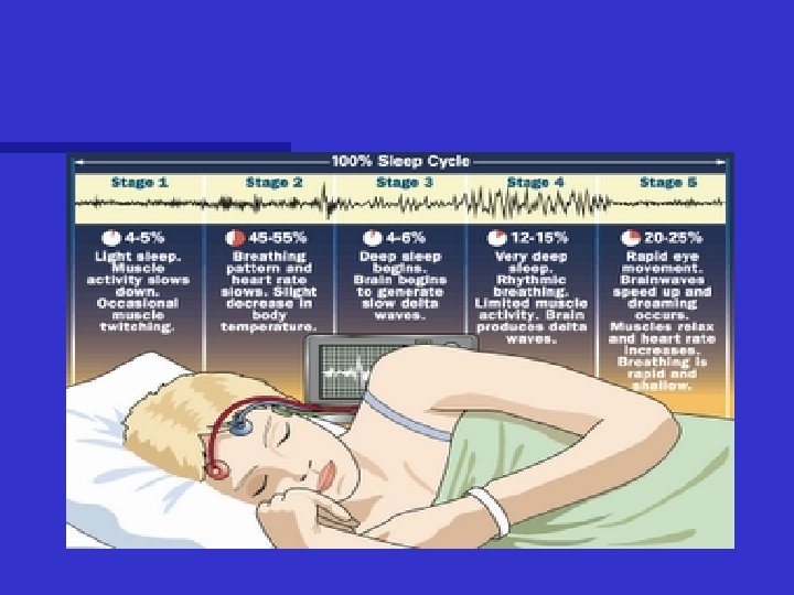 Stages of Sleep Awake and alert through Stage 2 (slide 13) n Stage 3 through REM Sleep (slide 16) n Methods of recording sleep and characteristics of the five stages (stages 1 through 4, or non -REM [NREM] and REM sleep). The typical EEG patterns are superimposed over the sleeper’s image. n