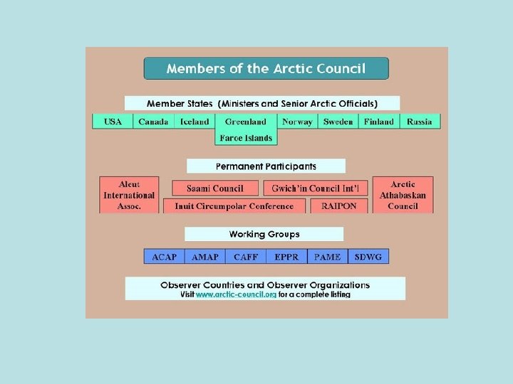 + Indigenous organizations (now six in number) elevated to status of Permanent Participants – Aleut International Association – Arctic Athabaskan Council – Gwich’in Council International – Innuit Circumpolar Council – Russian Association of Indigenous Peoples of the North (RAIPON) – Saami Council + Six Working Groups established – Arctic Monitoring and Assessment Program (AMAP) – Emergency Prevention, Preparedness and Response (EPPR) – Conservation of Arctic Flora and Fauna (CAFF) – Protection of the Arctic Marine Environment (PAME) – Sustainable Development Working Group (SDWG) (1998) – Arctic Contaminants Action Program (ACAP) (2006)