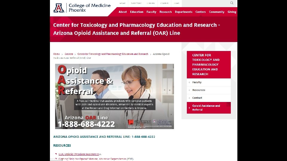 The Arizona OAR Line Assist patients, families and healthcare providers with any/all opioid-related issues: Acute toxicity Opiate withdrawal Drug-interactions Pregnancy-related issues MAT (medication-assisted treatment) Chronic pain Referrals for medical and behavioral health services Virtual case management (negotiate insurance issues)