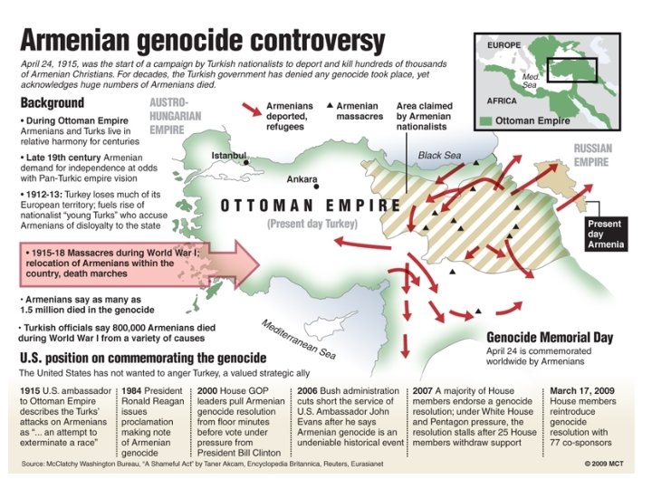 Armenian genocide dispute • • • Hundreds of thousands of Armenians died in 1915 at the hands of the Ottoman Turks, whose empire was disintegrating Many of the victims were civilians deported to barren desert regions where they died of starvation and thirst. Thousands also died in massacres Armenia says up to 1. 5 million people were killed. Turkey says the number of deaths was much smaller Most non-Turkish scholars of the events regard them as genocide - as do more than 20 states including France, Germany and Russia, and some international bodies such as the European Parliament Turkey rejects the term "genocide", maintaining that many of the dead were killed in clashes during World War One, and that many ethnic Turks also suffered in the conflict