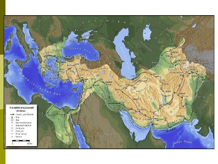 Alexander The Great: The Persian Conquest p p p Alexander’s army refuses to go any further He seeks to punish his men by returning through the deserts of Pakistan and loses 50% of his men Returns to Babylon by 324 B. C. and seeks to merge the Greek and Persian empires into one