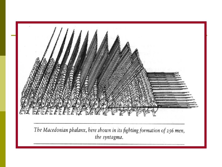 Phillip II p Army of Macedonia had many strengths n n n Army was based on heavy and light cavalry supported by hoplite phalanxes Phalanx consisted of Greek soldiers in a tight formation of shields and long lances Macedonians breed for war