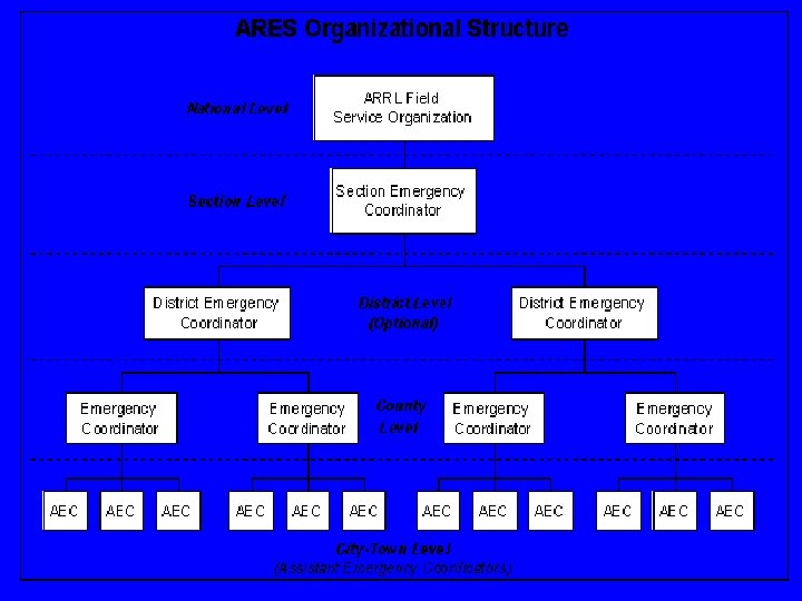 Amateur Radio Emergency Services (ARES) Among the largest and oldest emcomm groups is ARES, a program sponsored by the American Radio Relay League (ARRL) since 1935. ARES is part of the League's field organization, which is composed of "Sections". Most Sections are entire states, but some larger states have two or more Sections. The elected Section Manager (SM) appoints the ARES leadership. The top ARES leader in each Section is the Section Emergency Coordinator (SEC). Some larger Sections, like Wisconsin, Michigan, and Florida, are further divided into two or more Districts. In this case, each District is guided by a District Emergency Coordinator (DEC), working directly under the SEC. (See diagram below. )