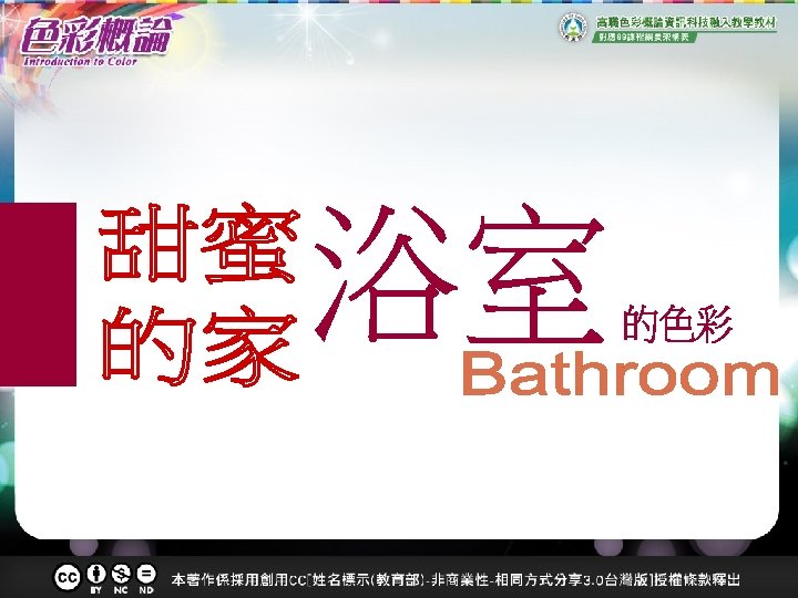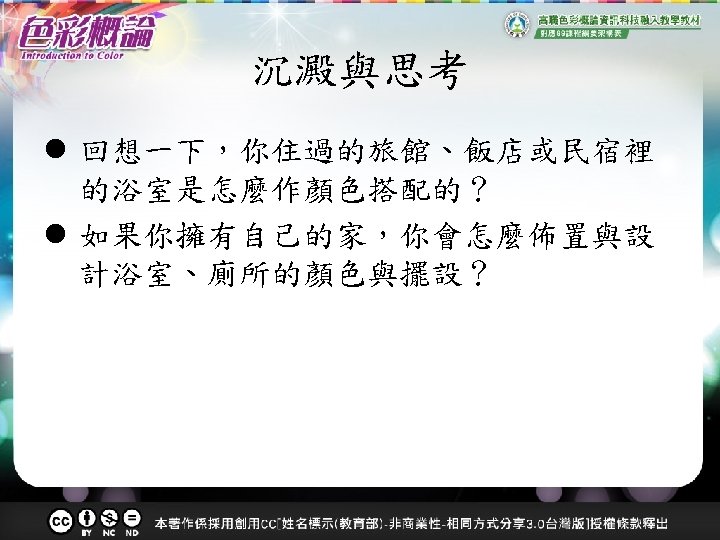 參考資料 • The Art of Bathroom Colors in Bathroom Design (http: //www. allbathroomdesigns. com/bathroom-colors. html) • 林芷欣編(2011)。令人滿意的居家設計:陽台+臥室+衛浴。台北:和 平國際。 • 建築名家浴室設計傑作選(2007)。MOOK情報誌。 • Caroline Murphy(2007)。101 IDEAS浴室裝潢(林云也譯)。台北:太 雅出版社。