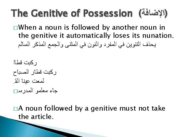 � Nothing must interpose between the noun and its following genitive ( )ﺍﻟﻤﻀﺎﻑ ﻭﺍﻟﻤﻀﺎﻑ ﺇﻟﻴﻪ � If the noun is to be qualified by an adjective, it must come after the genitive. ﺍﻧﺘﻈﺮﻧﻲ ﻋﻨﺪ ﺑﺎﺏ ﺍﻟﻤﺪﺭﺳﺔ ﺍﻟﺠﺪﻳﺪ � It is possible to form the genitive of possession with an indefinite genitive, but in such cases the noun remains indefinite. � ﻫﺬﺍ ﻛﺘﺎﺏ ﺭﺟﻞ