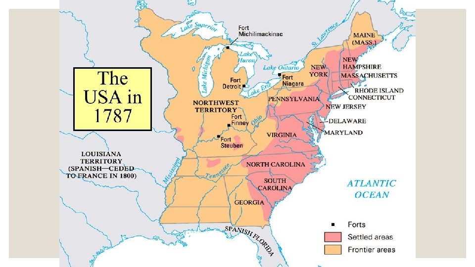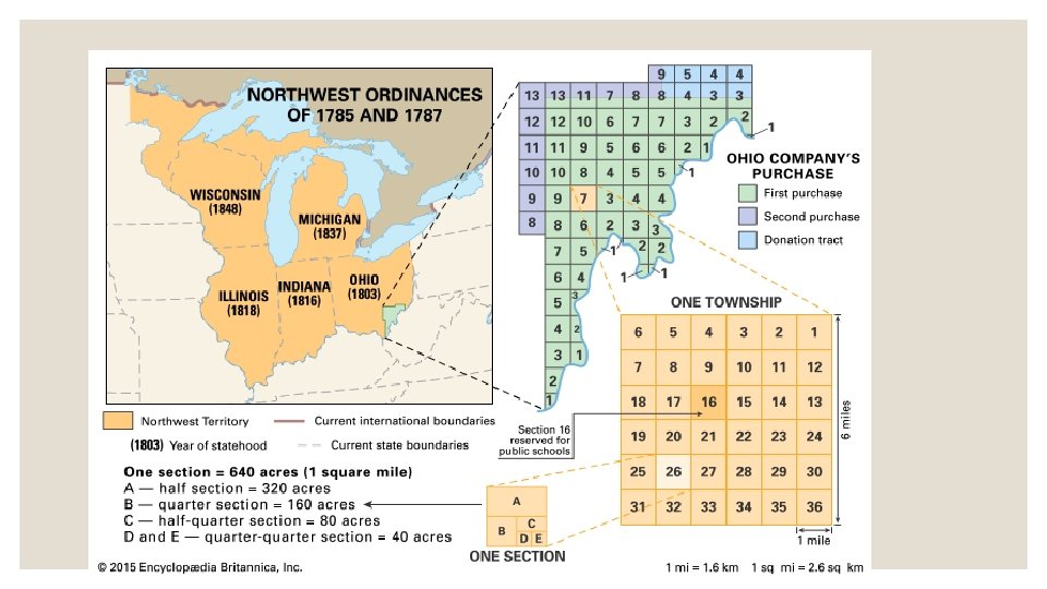 The northwest Ordinances • The Ordinance of 1785 measured pieces of land in the west and divided them into 36 townships. • The Northwest Ordinance of 1787 created the government in the Northwest territory. • It allowed for ways to adding new states into the Union.