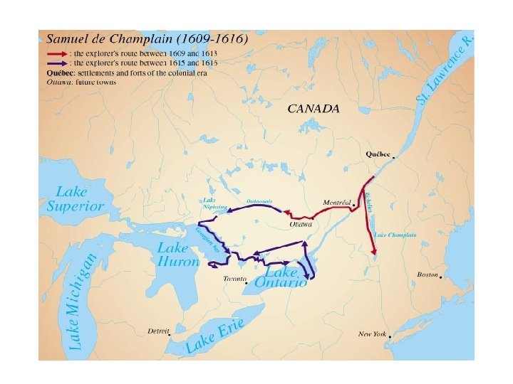 More French Explorers • Samuel de Champlain – Established Quebec with 32 colonists – Became the base for the French colonial empire – New France • Jacques Marquette – Explored Great Lakes regions and… – Upper Mississippi River