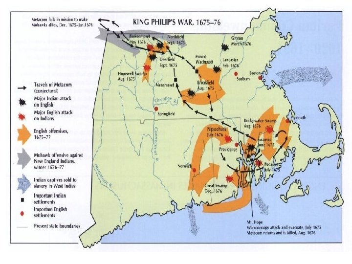 War Between Colonists and Natives • English battled Powhatan around Jamestown • King Philip’s War – Native leader Metacom and his warriors defeated by British – Massacres on both sides • Why do you think the fighting was so ferocious?