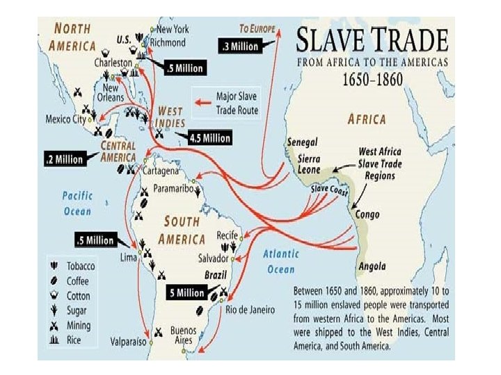 Atlantic Slave Trade (The Numbers) Between 1500 -1600 300, 000 slaves brought Between 1600 -1700 1. 3 million slaves brought • By 1870 • 9. 5 million slaves brought to Americas • •
