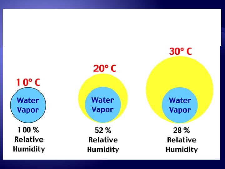 Humidity � There are two types of Humidity � 1) specific humidity �The actual mass of water present – gwater /kgair � 2)relative humidity � amount of water present as a percent of what it can hold. � As the air gets warmer it can hold more water