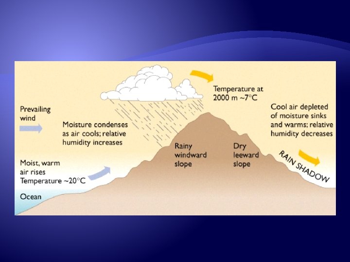 Where does it not rain? � The opposite of the above �Anywhere air is sinking from above �On the leeward side of mountains (rainshadow effect) �Zones of colder sinking air �Where winds diverge