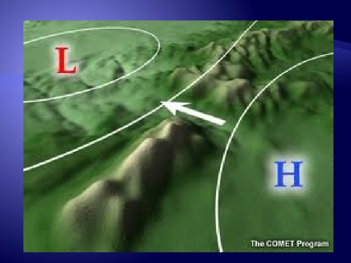 Low pressure systems � In a low pressure system, the air is rising – that means clouds and rain �Low pressure systems are usually created by a warm air mass pushing a cold dry one out of the way �Humid air is also less dense than dry air so air from the ocean will rise up and cause a low pressure