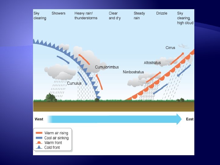 Fronts – the boundary between air masses � Air masses are large masses of air that have the same weather (temperature/humidity) �If the difference between air masses is great there will be a major change in the weather �Example – if there is a very cold air mass meeting a warm air mass �Since the cold air is much more dense it will slide under the warm air and push it upwards. � Whenever there is a front there is almost always rain