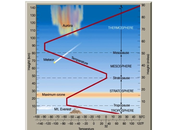 II. The Modern Atmosphere C. Layers of the Atmosphere 3. Mesosphere - The mesosphere extends from 260 K to 280 K ft (53 miles) above Earth’s surface. Here is where most meteors burn up upon entering the atmosphere. 2. Stratosphere - extends from the tropopause to about 170 K ft. Temperature increases with height due to increased absorption of UV radiation by the ozone layer. The stratopause, is found at 160 to 180 K ft. The pressure here is 1/1000 that of sea level. 1. Troposphere - begins at Earth’s surface. It’s thickness varies from 30 K ft at the poles to 56 K ft at the equator. This is the layer where Earth’s weather happens and contains 80% of the atmosphere’s mass.