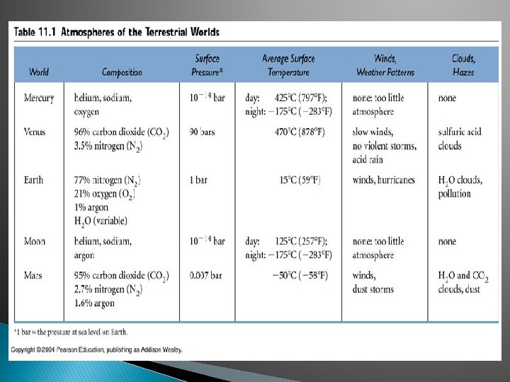 11. 1 Atmospheric Basics Our goals for learning: � Describe the general atmospheric properties of each of the five terrestrial worlds. � What is atmospheric pressure? � Summarize the effects of atmospheres. © 2005 Pearson Education Inc. , publishing as Addison. Wesley