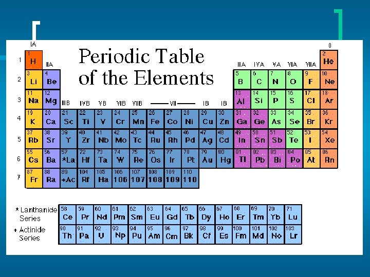 What’s in a square? n Different periodic tables can include various bits of information, but usually: ¡ atomic number ¡ symbol ¡ atomic mass ¡ number of valence electrons ¡ state of matter at room temperature.