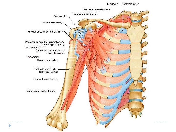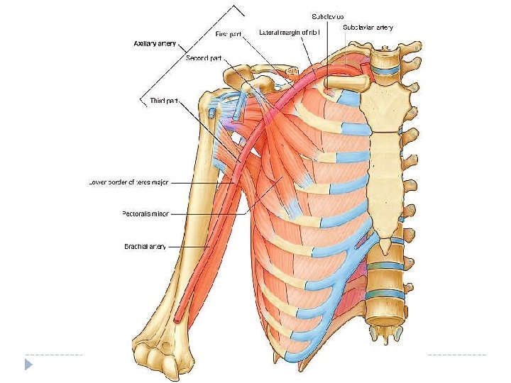 The Axillary artery 1 -1 Superior thoracic artery 2 -1 Thoracoacromial artery 2 -2 lateral thoracic artery 3 -1 Subscapular artery 3 -2 Ant. circumflex humeral artery 3 -3 Post. circumflex humeral artery 1 2 3