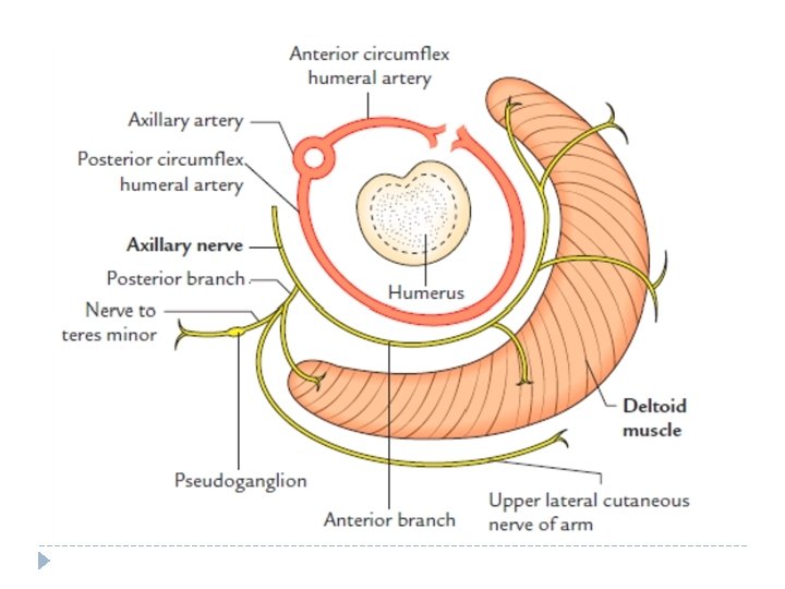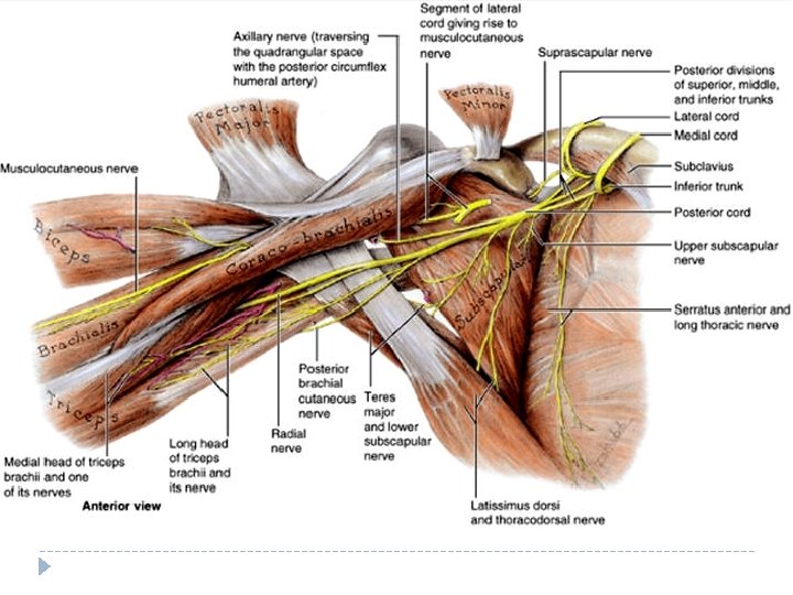 Branches from the posterior cord Ø Ø Ø Upper subscapular (C 5, 6) Lower subscapular (C 5, 6) Thoracodorsal (C 6, 7, 8) Axillary (C 5, 6) Radial (C 5 -T 1)