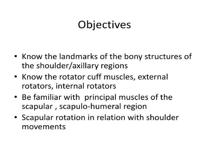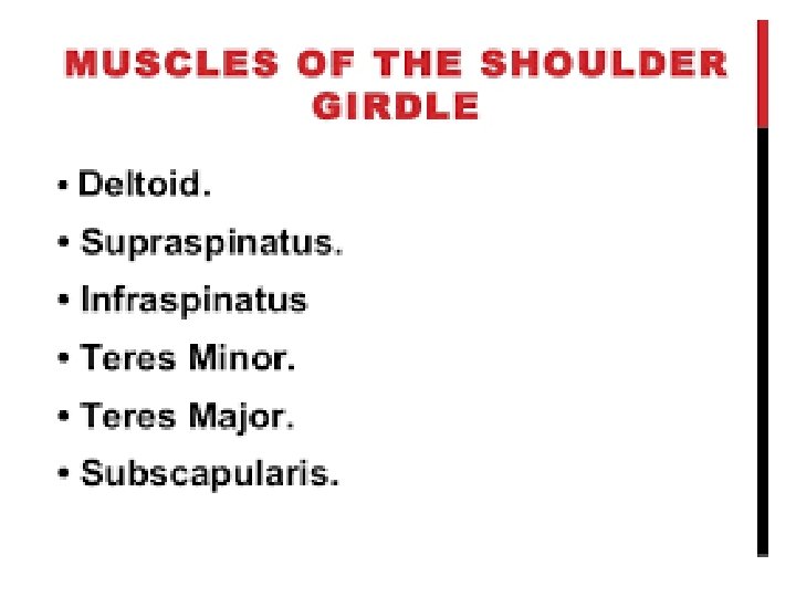 Deltoid Origin • Lateral third of clavicle, acromion, spine of scapula Insertion • Middle of lateral surface of shaft of humerus Nerve supply • Axillary nerve C 5, 6 Action • Middle fibers Abducts arm; anterior fibers flex and medially rotate arm; posterior fibers extend and laterally rotate arm • Abduction from 15 -90 degrees