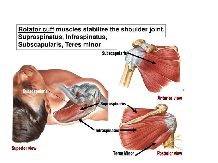 Rotator Cuff • The rotator cuff is the name given to the tendons of the subscapularis, supraspinatus, infraspinatus, and teres minor muscles • are fused to the underlying capsule of the shoulder joint • stabilizing the shoulder joint • The cuff is deficient inferiorly, and this is a site of potential weakness.