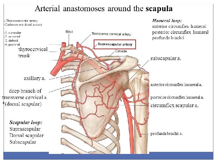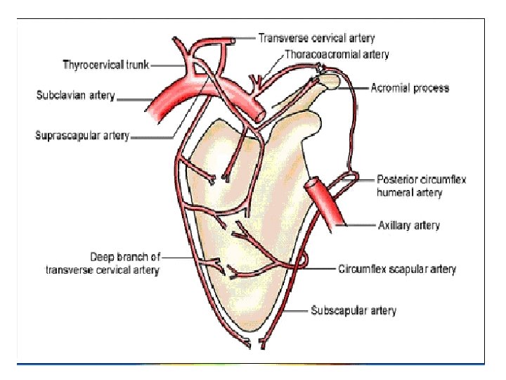 Arterial Anastomosis Around the Shoulder Joint Branches from the Subclavian Artery • The suprascapular artery, which is distributed to the supraspinous and infraspinous fossae of the scapula • The superficial or transverse cervical artery, which gives off a deep branch that runs down the medial border of the scapula Branches from the Axillary Artery • The subscapular artery and its circumflex scapular branch supply the subscapular and infraspinous fossae of the scapula, respectively. • The anterior circumflex humeral artery • The posterior circumflex humeral artery • Both the circumflex arteries form an anastomosing circle around the surgical neck of the humerus