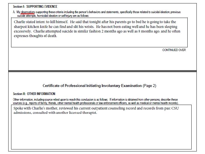 Additional elements to assess • ELDERLY ISSUES: wanders at night, leaves things on stove unattended, unrealistic fears, uncontrollable anxiety, confusion • MOOD: feels hopeless or helpless, flat affect • A person who expresses suicidal ideation but is too depressed to put together a plan should be strongly considered for involuntary examination. • SUBSTANCE ABUSE: abuse of prescribed medications, use of alcohol or illegal substances while taking medications