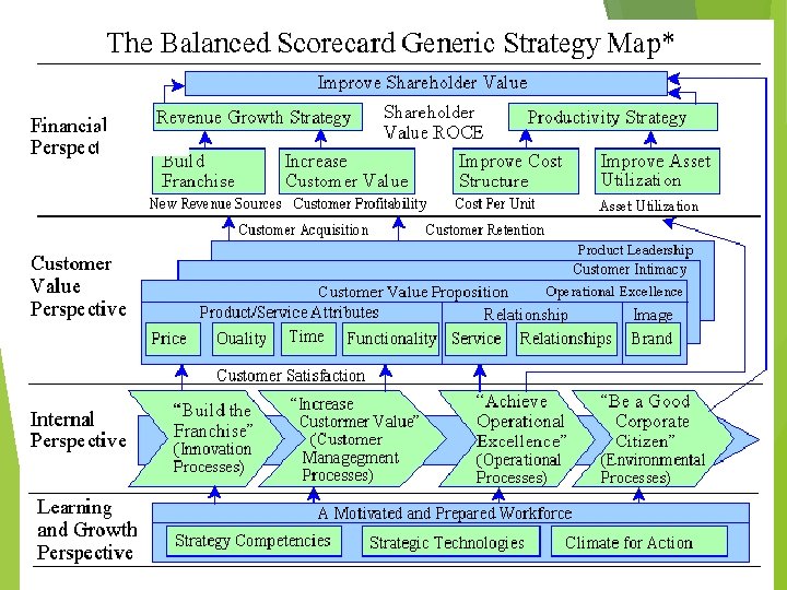 4 Business Perspectives Questions Financial Internal Business Process To satisfy our stakeholders, what must be our levels of productivity, efficiency, and quality? Learning and Growth What must we do to create sustainable economic value? How does our employee performance management system, including feedback to employees, support high performance? Customer What do our customers require from us and how are we doing according to those requirements?