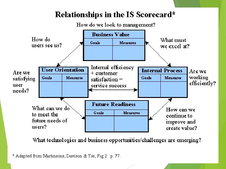 4 Original Business Perspectives n The Balanced Scorecard model suggests that we view the organization from 4 perspectives. n Then Develop metrics, collect data and analyze it relative to each of these perspectives