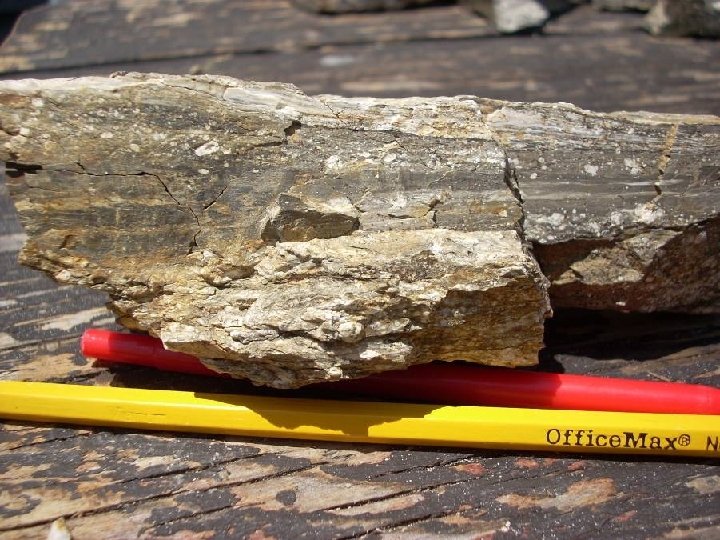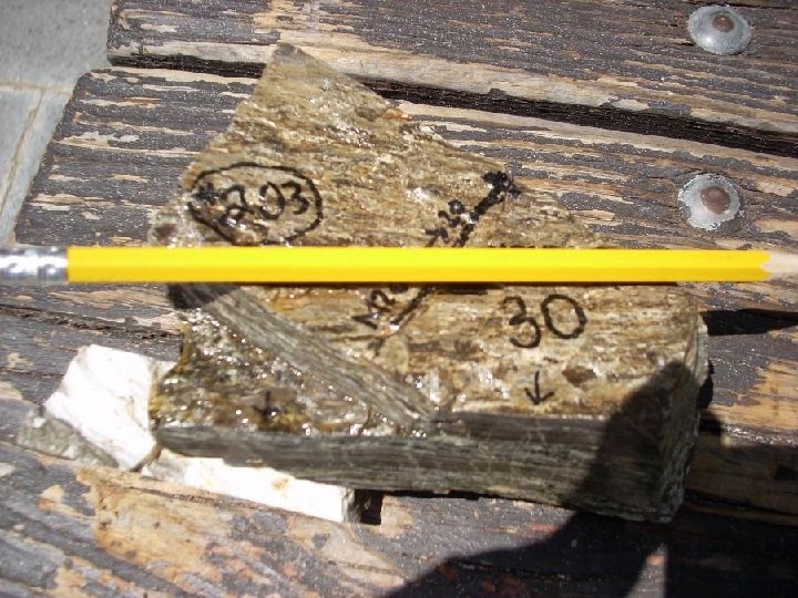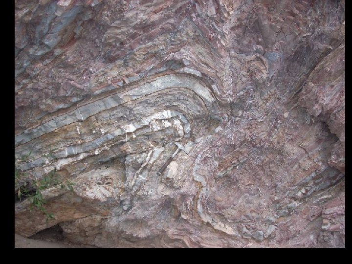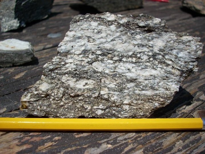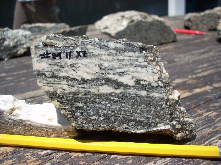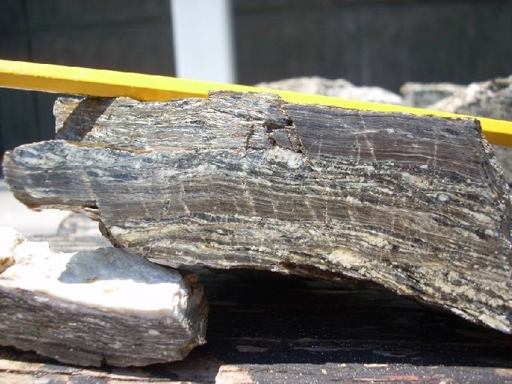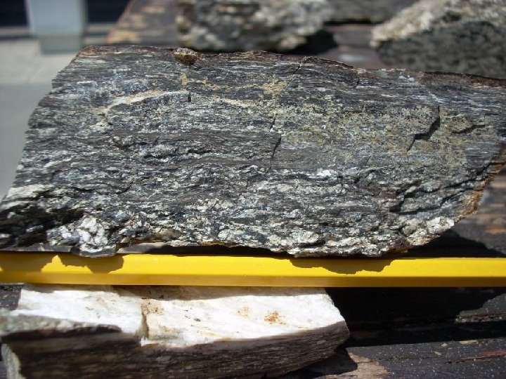 Foliation • Planar fabric formed by ductile flow of minerals under directed stress • Generally manifested as compositional layering • Foliation plane generally oriented at high angle to maximum stress direction