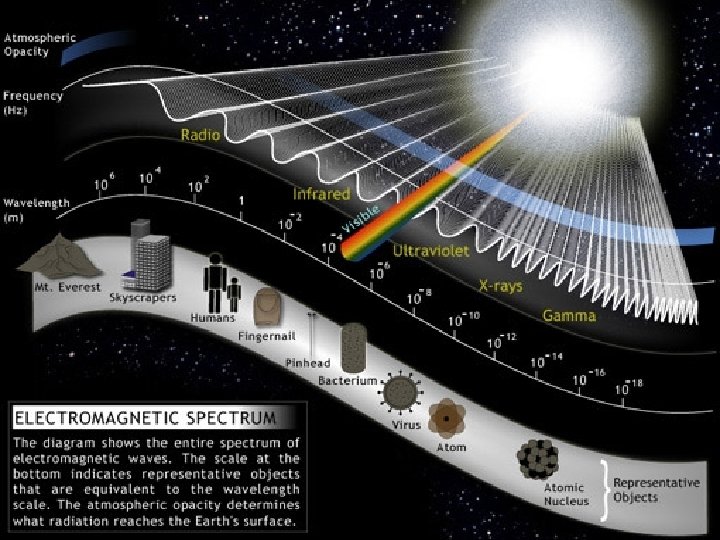� Light is a type of radiation; it is a type of wave that travels through space. � Light waves are fundamentally different from many other waves that travel only through material media (sound or water waves). � Light waves require NO material medium to travel from place to place. � The wave speed of all types of light in a vacuum is called the speed of light, c. c = 300, 000 km/sec