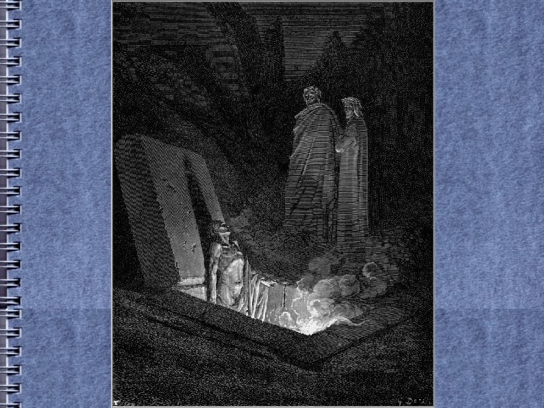 Hell: levels The third level – gluttons: rain, snow. The fourth level – misers (Scrooge) – rolling large stones. The fifth level – curmudgeons – Styx (Greek mytlology) The sixth level – infidels, cemetery, burning tombs The seventh level – violators (including suicides) The ninth level – traitors. Lucifer.