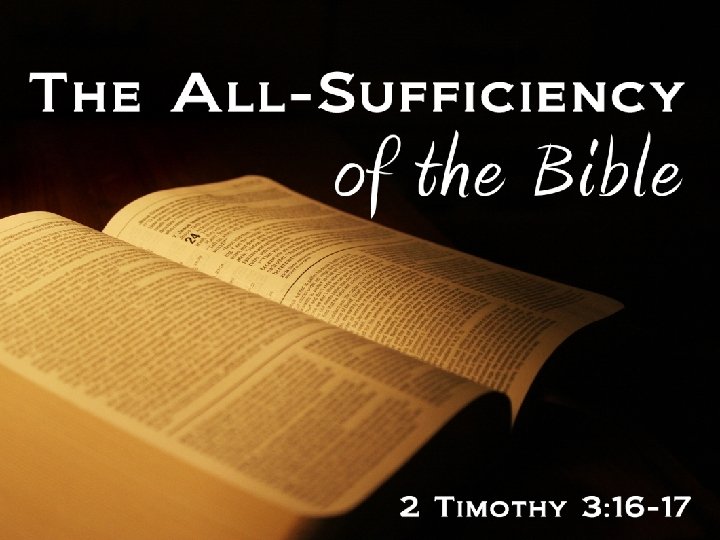 The Central Text • “ALL Scripture is inspired by God” (2 Tim. 3: 16) • “ALL Scripture is…profitable for…” (3: 16) − − “Doctrine” = Showing what is right “Reproof” = Showing what is wrong “Correction” = Showing how to get right “Instruction in righteousness” = Showing how to stay right • “ALL Scripture is inspired…that the man of God may be…” (17) − “Complete” – what else do I need? − “Thoroughly equipped” – what is lacking? − “For every good work” – what has God not supplied? • The Bible is absolutely all-sufficient, to meet all the demands of being a Christian and serving/following God!