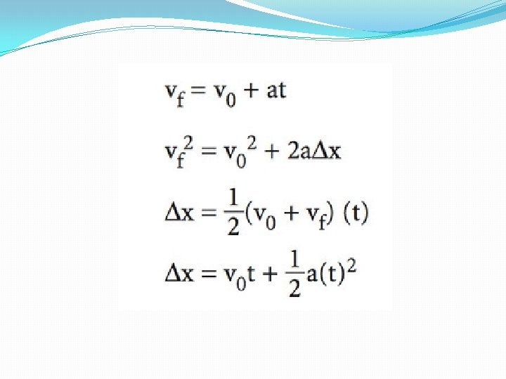 Equation 1 �Where �Vf = Final Velocity �V 0 = Initial Velocity �a = Acceleration �t = Time