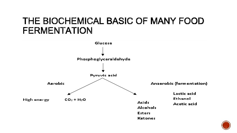o Fermentation as the result of an anaerobic type of metabolism. The most commonly used microorganisms is glucose. energy substrate among o In the presence of oxygen many microorganisms metabolitze glucose producing water, carrbondioxide and large amounts of energy (ATP) which is used for growth activities. o Such end product metabolites often include large amounts of lactic acid, acetid acid and ethanol as well as minor amounts of other volatile organic acids, alcohols and their esters.