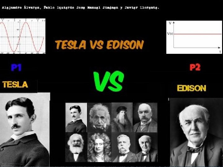 The War of the Currents (Tesla vs Edison). The war of the currents was an economic ad tecnological dispute in the decade of the 1880 s between Tesla and Edison for the distributoin of the electric energy. There were two important people (apart from Tesla and Edison) that were J. P. Morgan( the one who support Edison) and George Westinghouse ( the one who suported Tesla). Edison though that the direct current would bve bettern for providing electricity, but at the end it was saw that the alternative current of Tesla was far better. Tesla gave the rights of his pattents to G. Westinghouse, which ended in this man not paying a high salary to Tesla (only 10$ per week). By the other side, Edison didn´t let J. P. Morgan control his pattents, but Edison´s industry was renamed to General Electric. This batlle was mainly a public relations batlle, because they both fought for proving their energy was better. At first, Edison tried to prove that Tesla´s alternative current was harmfull by electrocuting cats, dogs even an elephat (this electrocution in particular was saw in a film of 1903). Then Tesla made a bolt of alternative current topass trough his body, proving that it was harmless. Thanks to this, Edison