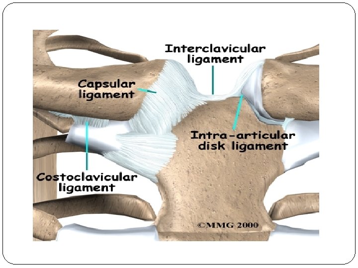 Sternoclavicular Joint Provides major axis of rotation for movement of clavicle and scapula Freely permitted frontal and transverse plane motion. Close pack position is with maximum shoulder elevation