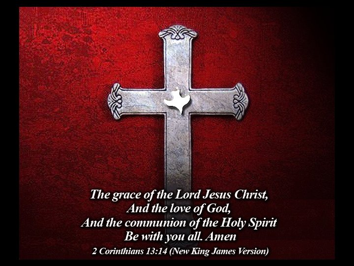The Blessing 2 Corinthians 13: 14 ___________________________ The grace of the Lord Jesus Christ And the love of God And the fellowship of the Holy Spirit be with all of you