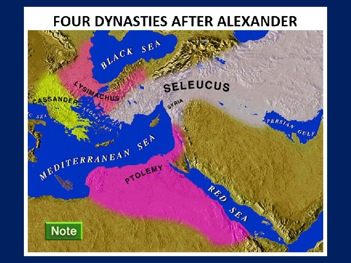 Four Generals Daniel 7: 6; 8: 8, 22 Cassander Macedonia Ptolemy Egypt Lysimachus Thrace & Asia Minor Seleucus Syria (including Israel)