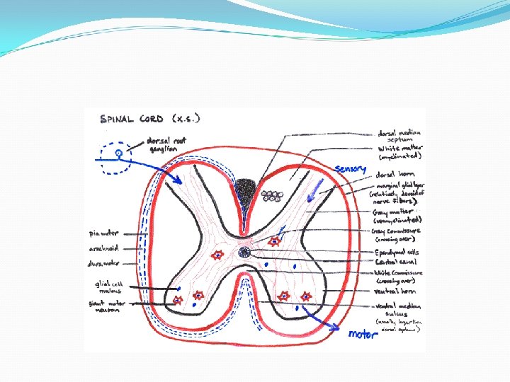 3. Each spinal nerve arises from two roots: a dorsal, or sensory, root, and a ventral, or motor, root. 4. The main branches of some spinal nerves form plexuses.