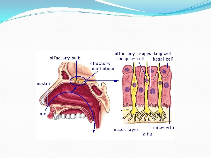 3. Chemoreceptors contain Cilia that extend into the air passageways of the nose and react to Chemicals in the Air. Chemicals that come into contact with the Chemoreceptors Stimulate them, causing Impulses to be sent to the Brain by the OLFACTORY NERVE