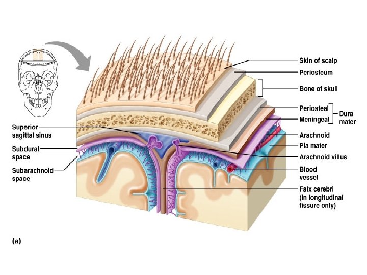 Cranial Meninges - 3 layer protective membrane 1. Dura Mater - Composed of two layers: a) Periosteal – outer layer, attaches to bone. b) Meningeal – inner layer, closer to brain. Two layers fused, except to enclose the dural sinuses 2. Arachnoid Layer - ‘spider’ web like. 3. Pia Mater - delicate, follows convolutions.