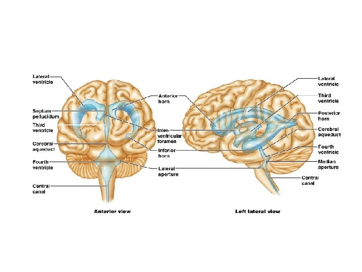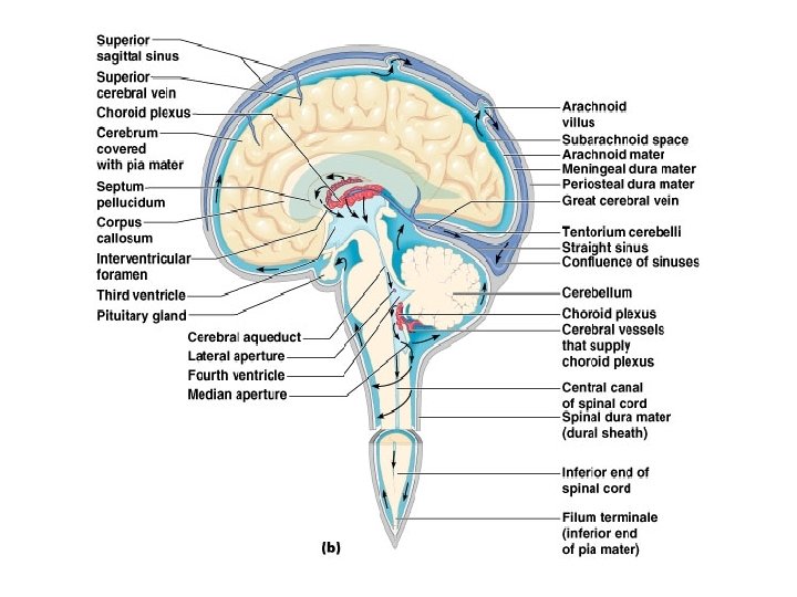 Cerebrospinal Fluid (CSF) Roles of CSF: 1. Cushions and insulates delicate nervous tissue. 2. Gives Buoyancy to the brain (“floats” in CSF). 3. Exchange of gases (O 2 and CO 2), nutrients and wastes. * CSF formed in the choroid plexuses in ventricles of brain