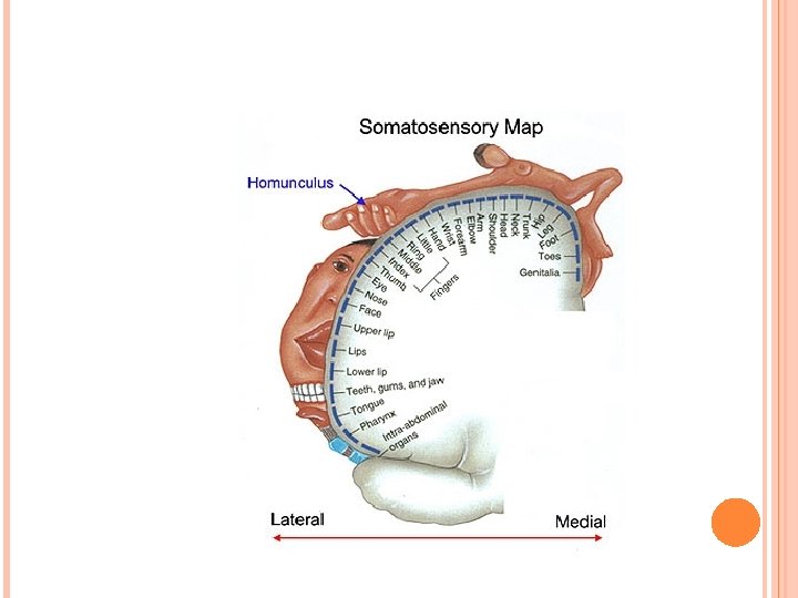 PRIMARY SOMATOSENSORY CORTEX We can think of this area of the parietal lobe as a homunculus or “little man. ” The homunculus is a distorted body man, with each part of the body sized according to how much space the brain gives to processing information about that body part. For example, because so many neurons process information from the hands and lips, the homunculus’s hands and lips are remarkably oversized; while the area devoted to the hips do not take up much room (see picture on next pg. ).