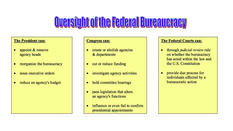 Congress and the Bureaucracy • Duplication: Congress rarely gives any one job to a single agency; prevents any one agency from becoming too powerful • Authorization: No agency may spend money unless it has first been authorized and appropriated by Congress. • Hearings: Congressional committees may hold hearings to question agency actions or abuses publicly. • Legislation: can make legislation more detailed to restrict an agency’s power.