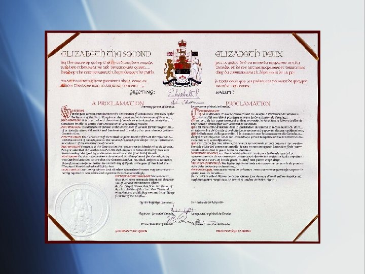 The Canadian Charter of Rights and Freedoms § The Canadian Charter of Rights and Freedoms was established in the Constitution of 1982 § The Charter is an improvement of the 1960 Bill of Rights § The Charter relates to the rights and freedoms that exist in Canada as well as the limits that can be placed upon them § The Charter protects the interests of all Canadians